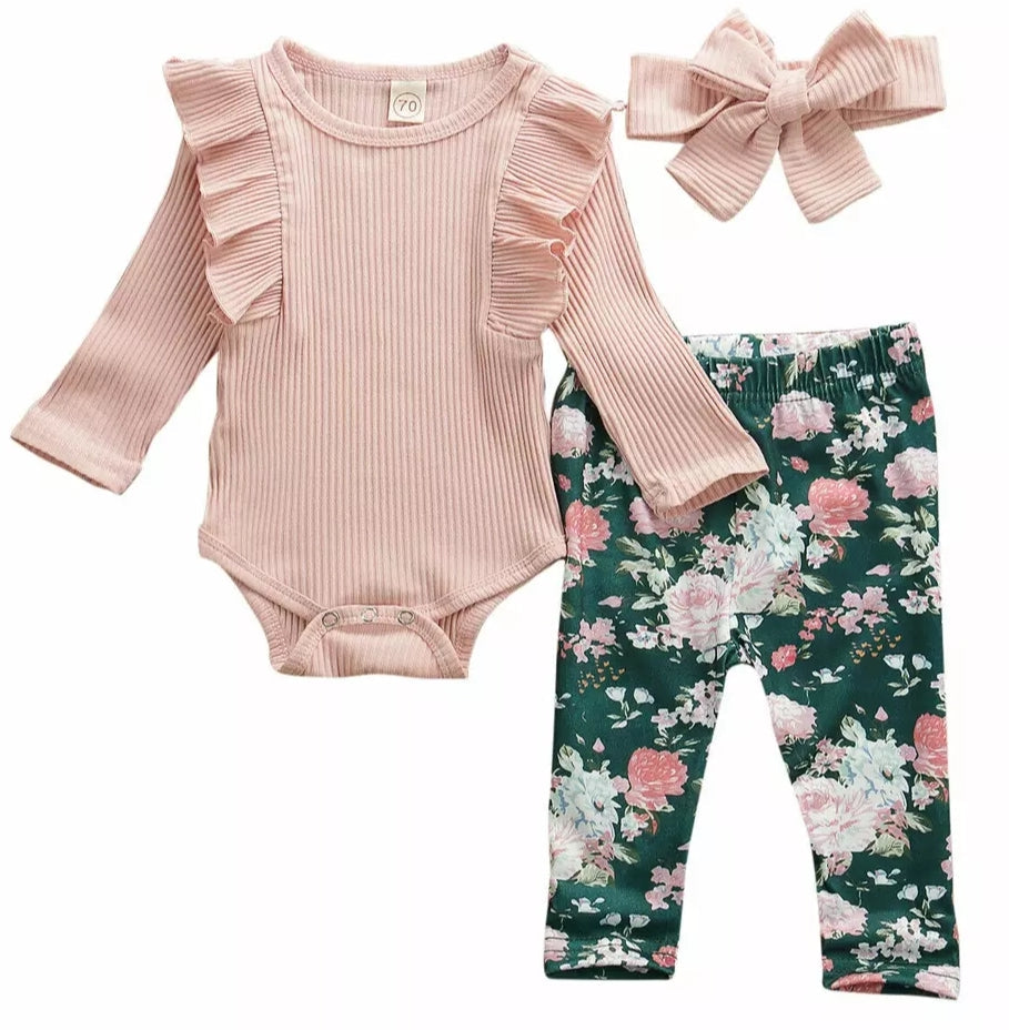 Ribbed Dusty Pink Ruffle Romper with Floral Leggings and Headband
