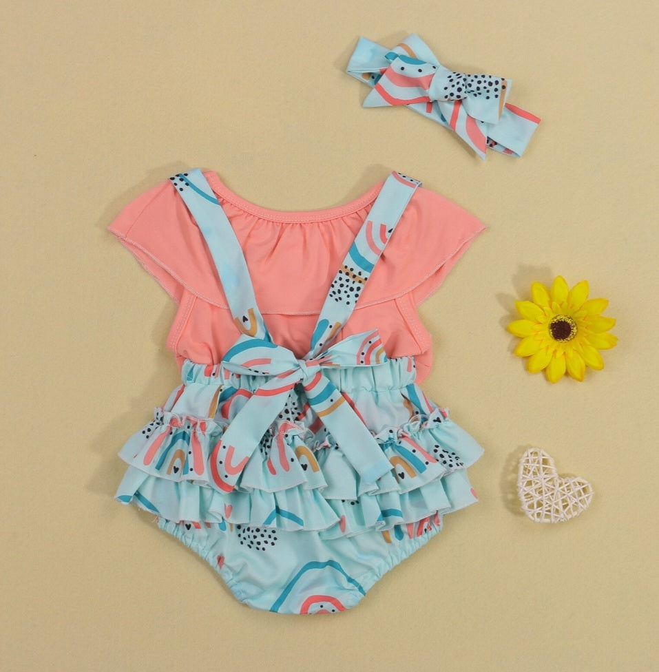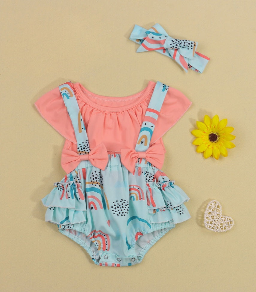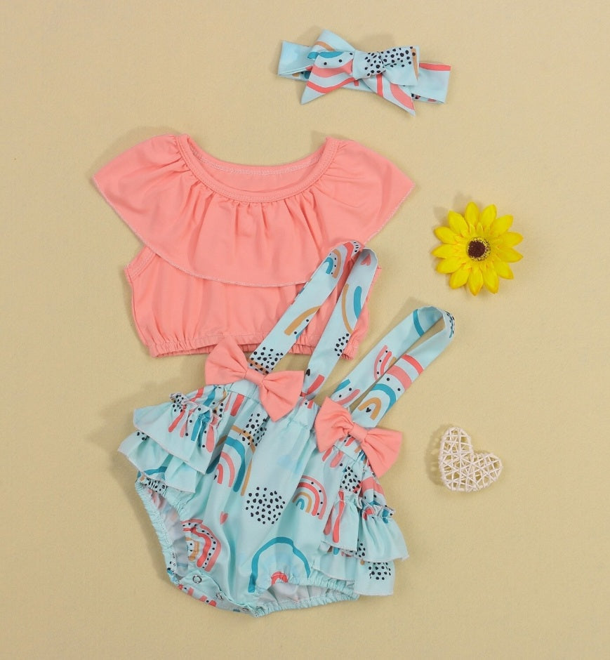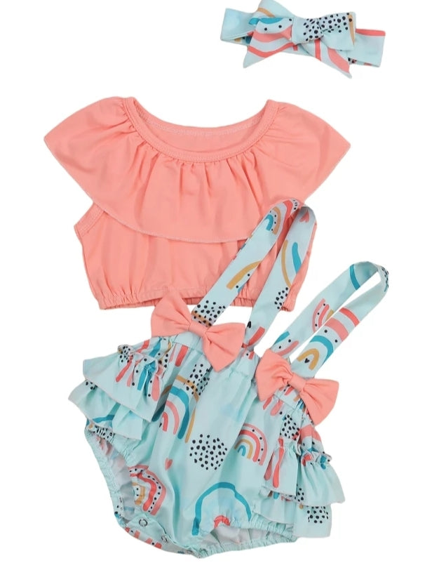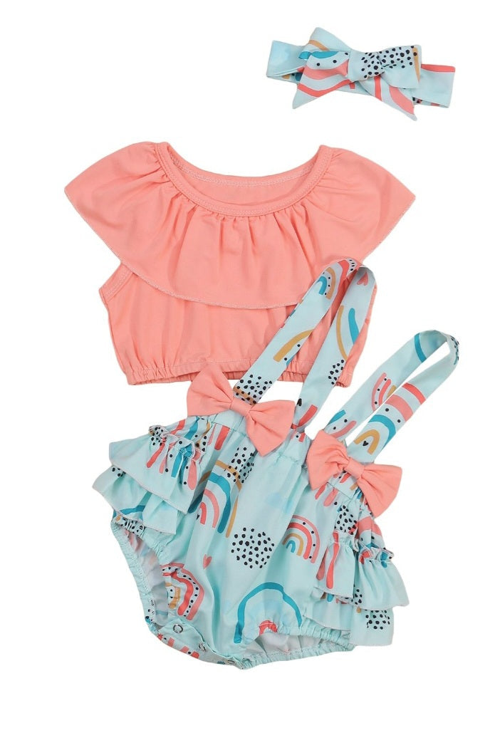 Peach Crop Top and Rainbow Overall Shorts and Headband