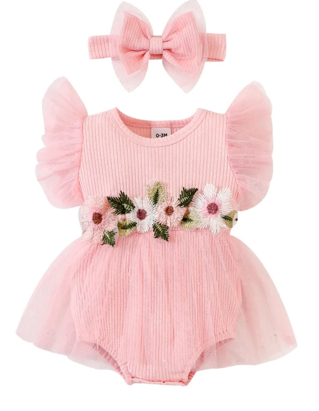Pink Floral Ribbed Romper with Romantic Tulle Tutu and Headband