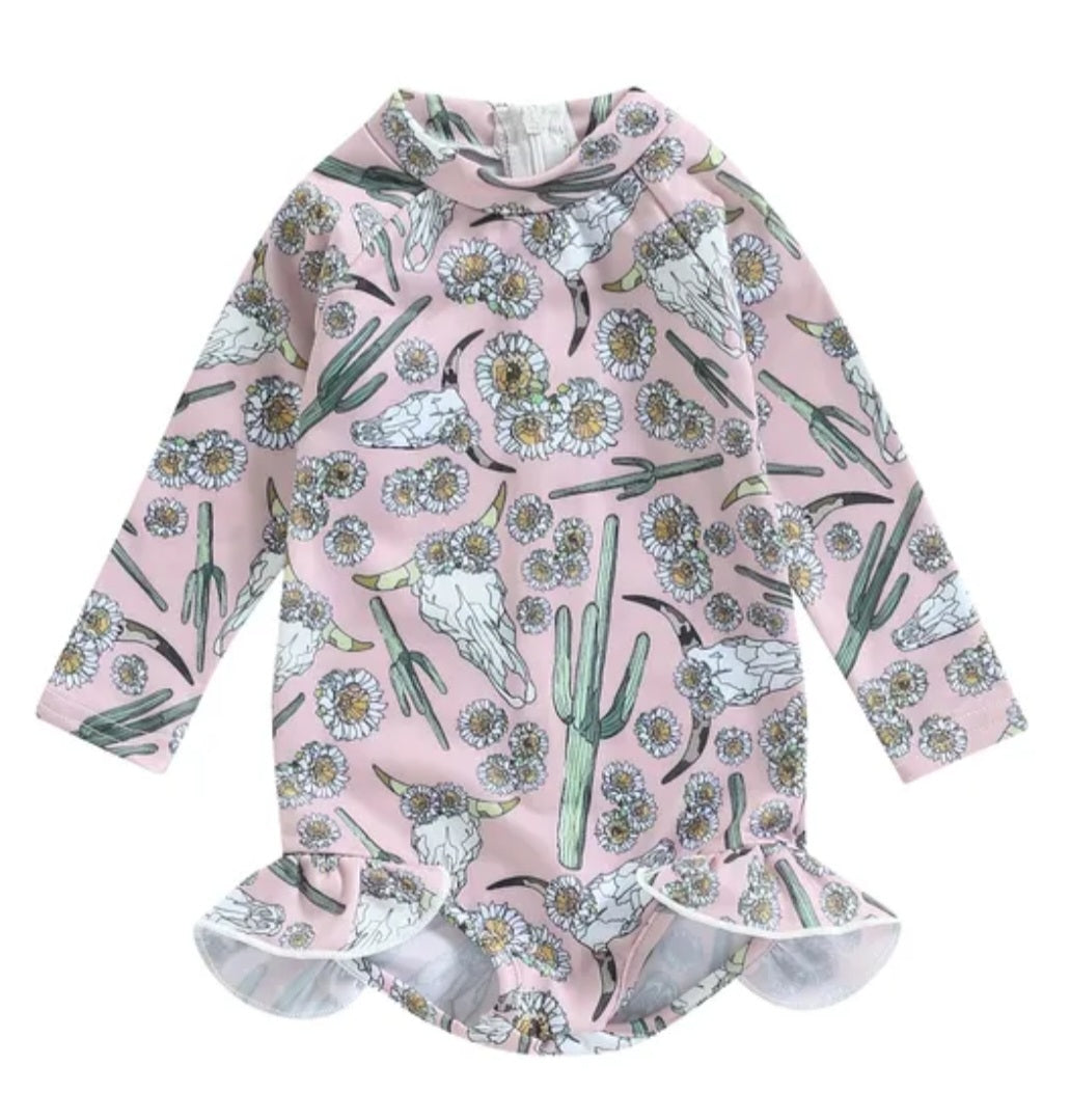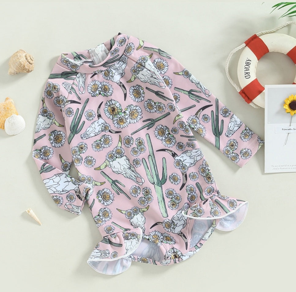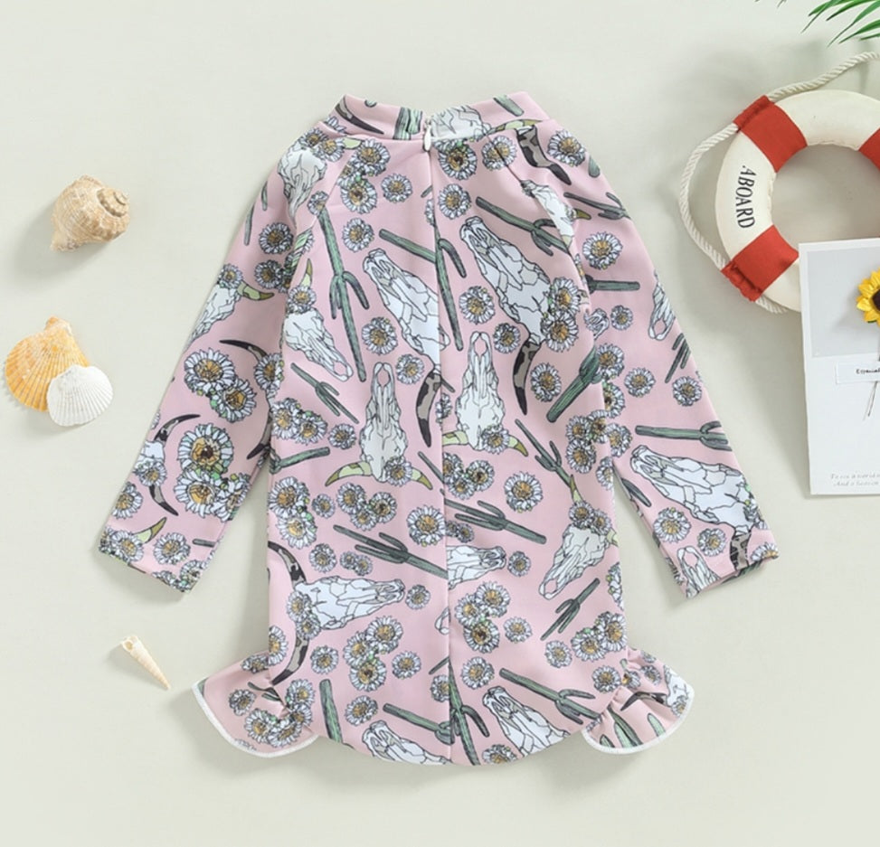 Bucramium, Floral Cow Skull Long Sleeve Swimsuit