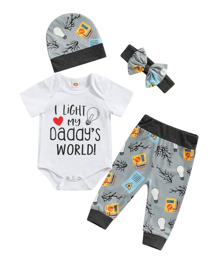 I Light My Daddy's World Romper with Matching Pants, Hat and Headband Gender Neutral 1000128